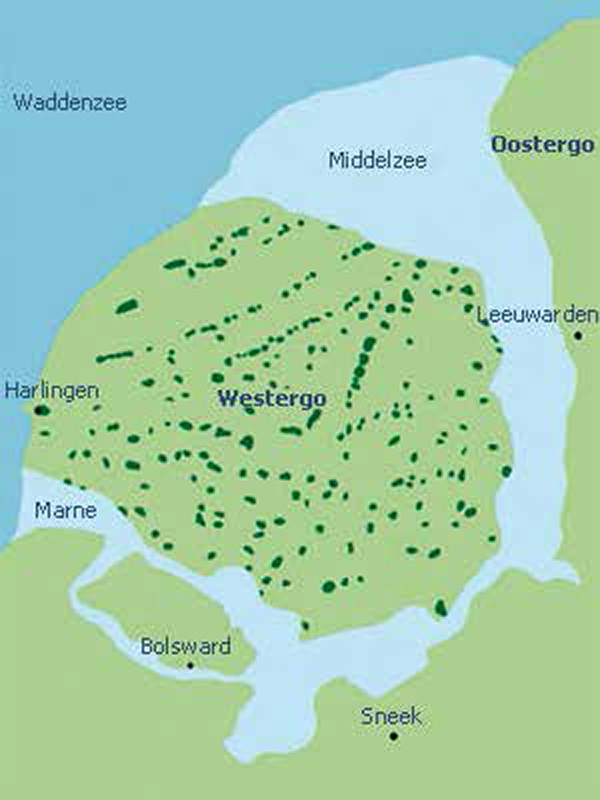 de oude Middelzee, de zuidelijke oeverwal van de riviertjes de Boorn en Moezel en de voormalige boezemlanden ten noorden van het Sneekermeer.