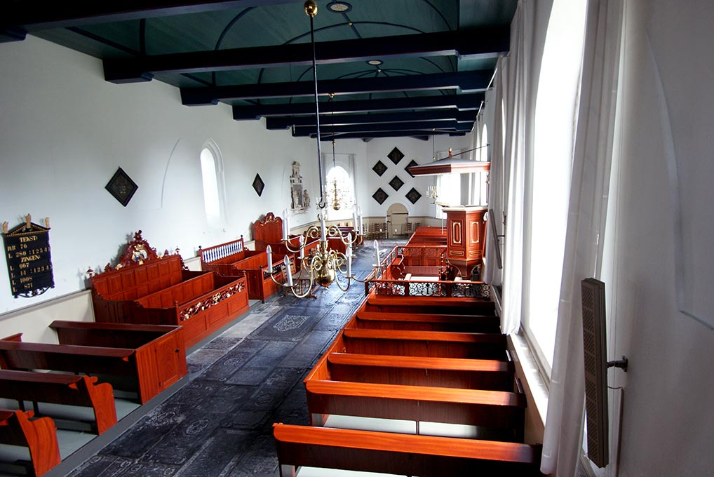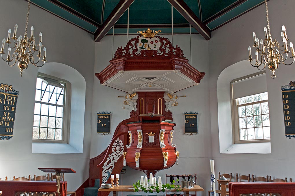 dateert van 1867, evenals de mooie preekstoel van K.F. Ozinga. Aan de wanden hangen negen