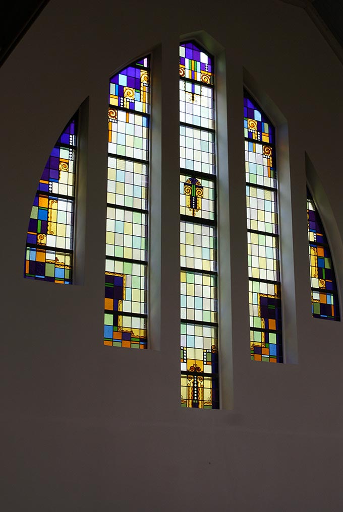 Opvallend in het interieur van de kerk zijn onder andere de preekstoel en de gebrandschilderde ramen, allebei daterend uit de