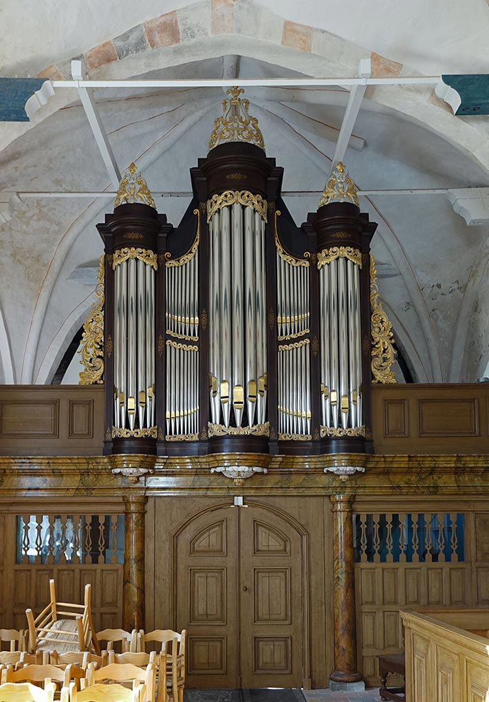 dan weer zijn onmisbare aandeel in de plenumklank leveren. In Longerhouw krijgt de kas zijn oorspronkelijke deftige kleurstelling