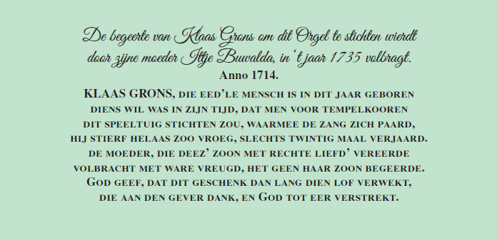 zwelkast) is de volgende inscriptie te vinden: “Anno 1739 is dit orgell door haer Koniglieke hogheyt de kroonbrincesse Anna, gemalin van Sien Hogheit dem brins van Orange