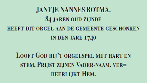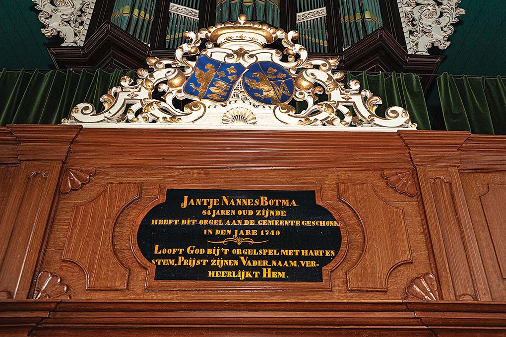 met daarnaast het wapen van Schwartzburg. Het orgel was een geschenk van Jantje Nannes Botma, weduwe van “boer, bysitter en dykgreve”